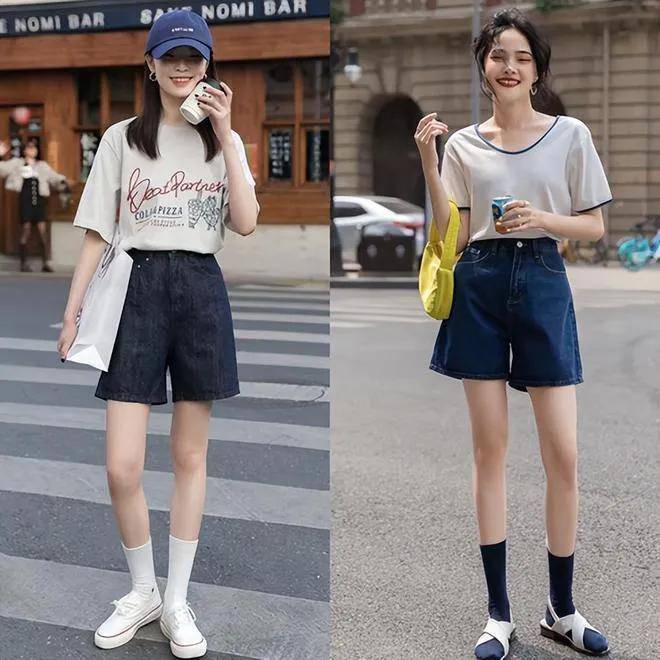 1. T恤+短裤:宽松印花T恤搭配牛仔短裤,活力满满。将T恤一角塞进短裤,造型感立现。搭配白色运动鞋、彩色长袜与棒球帽,无论是运动还是与朋友出游,都是最酷的存在。