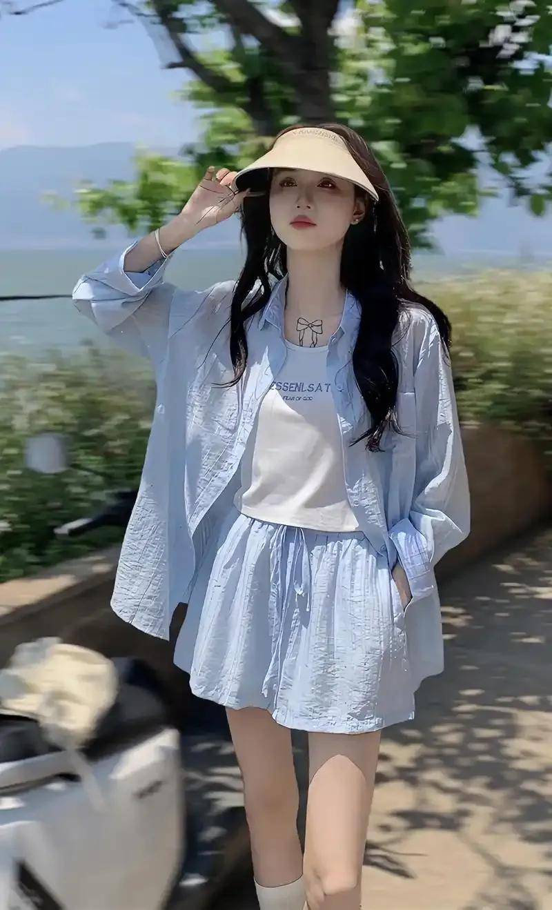 2. 碎花裙+防晒衫:白色底色带蓝色碎花的连衣裙颇具夏日氛围,收腰设计更显身材。若担心被晒黑,披上白色薄开衫,既能防晒又能增添穿搭层次感。搭配淡蓝色坡跟凉鞋与编织手提包,适合海边游玩或逛街。