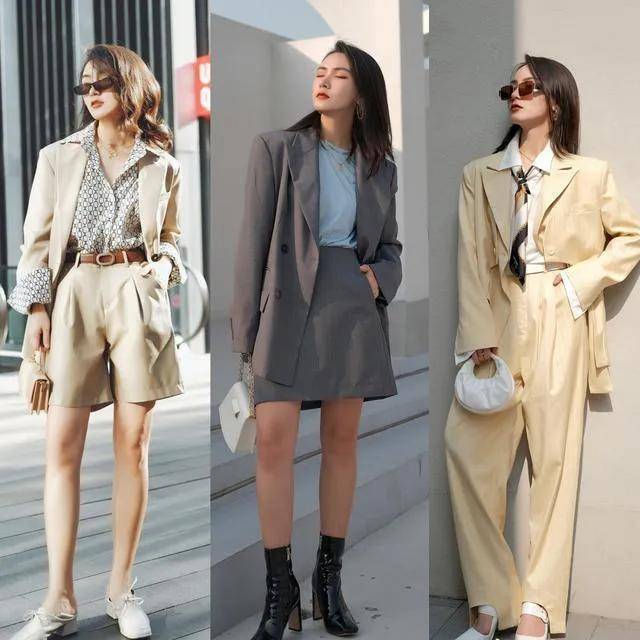 2. 西装套装:薄荷绿色西装外套搭配同色西装裤,内搭黑色吊带背心,帅气时髦。穿上黑色马丁靴,背个黑色斜挎包,这种甜酷风格不仅适合拍照,日常穿着也十分引人注目。
